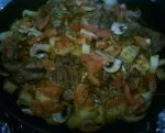 במחבת גדולה מחממים את השמן. באשר השמן חם מוסיפים את הבצל הקצוץ. לאחר כחצי דקה מוסיפים את בשר העגל. מטגנים כדקה על צד אחד והופכים לצד השני. מוסיפים את הבצל הפרוס, השום, פלפל הצ'ילי, הפטריות ומפזרים מעל את כל התבלינים. מוסיפים את ציר העוף ומנמיכים את האש. לאחר כשלוש דקות מוסיפים את העגבנייה מלמעלה. מכניסים לתנור שחומם מראש למאה ושמונים מעלות למשך כעשרים וחמש דקות עד חצי שעה.