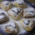 מרדדים על משטח מקומח את הבצק לעלה דק. קורצים עיגולים, מניחים כפית מהמילוי ומקפלים לצורת אוזן המן. מעבירים לתבנית מרופדת בנייר אפייה ואופים בתנור שחומם מראש ל-180 מעלות כ-20 דקות, עד להזהבה קלה. מוציאים מהתנור ומפזרים אבקת סוכר. מצננים ומגישים.