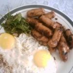 מחממים עוד קצת שמן במחבת ומוסיפים את הביצים לטיגון קל (עשייה פשוטה של ביצי עין). מתבלים במעט מלח ופלפל את הביצים. מעבירים לצד הנקניקיות בצלחת ההגשה.