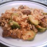 במחבת מחממים את השמן. מטגנים את הבצל קלות עד להזהבה. מוסיפים את הצ'ילי ומטגנים ביחד חצי דקה. מוסיפים את כרוב הניצנים ואת הקציצות ומטגנים עוד כשתי דקות ביחד. מוסיפים את האורז, הרסק והמים ומעט מלח, מערבבים היטב ומבשלים עד שהנוזלים מתאדים.