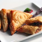 4. פורסים את עלי בצק העלים ומחלקים כל אחד ל 4 ריבועים וממלאים כל משולש כפית מילוי