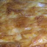 משמנים היטב תבנית אפייה, משאירים שני דפי פילו שלמים לכיסוי המאפה (שומרים תחת מגבת לחה, הבצק הזה מתייבש במהירות).