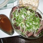 - מניחים לבשר להתקרר קצת ופורסים אותו דק. את הפרוסות מניחים על מצע של חסה ומפזרים מעל בצל פרוס ופטרוזיליה קצוצה.