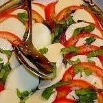 להניח את פרוסות העגבניה והמוצרלה לסרוגין בשורות או מעגלים על צלחת הגשה, לפזר מעל את עליי הבזיליקום, לצקת שמן זית וחומץ בלזמי, להמליח . ולהגיש מיד .