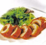 6. עוטפים כל גליל עוף ממולא בשלוש פרוסות אווז או בייקון ומחזקים בעזרת- קיסמי ע