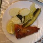 הצעת הגשה. כתוספת לפילה דג מטוגן ופרוסות תפוחי אדמה שבושלו במים