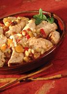 2. מערבבים יחד את פרוסות הפלפל, השום, מיץ הלימון, 2 כפות שמן זית, מלח, קינמון והל