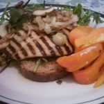 בתמונה מוגש על גבי לחם שיפון קלוי ובליווי בצל ופטריות מוקפצים בשמן זית, סלט ירוק ופלפל כתום מוקפץ. מעדן!
