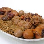 להכניס את הבצל והתבלינים לסיר ולסדר את העצמות בתחתית מעל את הקיטניות בשר שוב קיטניות ותפוא לפי הסדר ולמלא את הסיר עם מים רותחים עד 3 ס"מ מעל גובה התכולה.