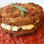 6. מסדרים על תבנית מחצית מפרוסות החצילים בשכבה אחת . מניחים פרוסת גבינת עיזים על גבי כל פרוסת חציל ומכסים עם פרוסות החצילים הנותרים.