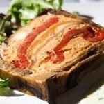 מרפדים תבנית "אינגליש קייק" בניילון ניצמד ששוליו יוצאים עד תחתיתה מעל מרפדים בחצילים מטוגנים כך שיבצבצו מחוץ לתבנית ועוד שיכבה לאורך התבנית