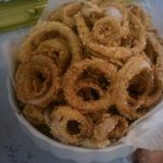 מערבבים את החלב עם היוגורט ומשרים בו את טבעות הבצל למשך הלילה. מערבבים את שני סוגי הקמח, הפפריקה החריפה והמתוקה והמלח לתערובת אחידה. מחממים את השמן לטיגון עמוק. טובלים את טבעות הבצל המושרות בתערובת הקמחים ומטגנים בשמן עמוק להזהבה מכל הכיוונים.