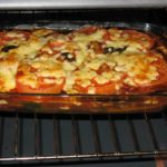 בתבנית מסדרים שכבה של חצילים. מעל מסדרים את הפלפלים הקלויים. מעל יוצקים את תכולת תערובת התרד (כאשר משאירים כשתי כפות מהרוטב בצד). מעל מסדרים את הבצל הקלוי ומפזרים את הבצל הירוק ורבע מכמות הגבינה. מסדרים מעל את החצילים הנותרים. מעל החצילים מסדרים את פרוסות העגבנייה ויוצקים מעליה את הרוטב שהשארנו בצד. מפזרים את יתרת הגבינה מעל ומכניסים לתנור שחומם ל-180 מעלות למשך 30-35 דקות.