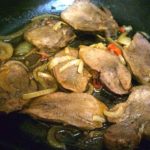 מחממים שמן במחבת רחבה. מטגנים את הבצל להזהבה ומוסיפים את השום הקצוץ והצ'ילי הקצוץ. מטגנים קלות ומוסיפים את פרוסות הלשון. לאחר הקפצה קלה ביחד מוסיפים כוס מים ושתי כפיות ממרח קארי אדום. מערבבים היטב ומצמצמים עד שלא נשארים כמעט נוזלים. מגישים חם.