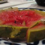 2. חותכים את האבטיח לפרוסות של 1 ס"מ לרבות קליפת האבטיח ומסדרים בצנצנת