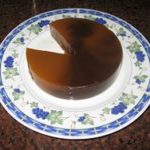 6. להגשה: מפזרים על צלחת אישית פרוסות דקות של גבינת גליל. הופכים את התבנית האישית על הגבינה ומחלצים את הדולסה דה בטטה. אם משתמשים בתבנית גדולה, חותכים פרוסות או קוביות ומגישים הפוך,עם השוקולד צ'יפס או האוכמניות למעלה