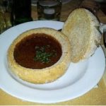 מרק גולש צועני מהונגריה עם בשר בקערית לחם מלא בתוכן