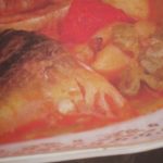 תפוחי אדמה, פרוסות דג וטבעות פלפלים. מעליהם מניחים