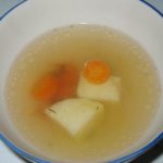 מניחים בסיר את הגזר ותפוח האדמה עם השמן ומאדים קלות. מוסיפים את העוף ומערבבים. מוסיפים מים כדי שלושת רבעי גובה הסיר. נועצים בבצל את מסמרי הציפורן ומוסיפים לסיר. מוסיפים את השום, הזנגביל, העגבנייה, הלימון, עלה הדפנה, המלח והפלפל ומביאים לרתיחה. מקפים, מנמיכים את האש ומוסיפים את השמיר. מכסים את הסיר ומבשלים יחד כחצי שעה. מסירים מהאש ומוציאים מתכולת הסיר את השמיר, השום, הזנגביל, הבצל ועלה הדפנה.