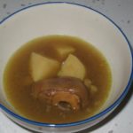 להגיש בצלחת מרק נתח בשר וחתיכת תפוח אדמה