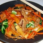 6.מסננים את האטריות ומערבבים עם 3 כפות רוטב