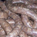 3. הכנת הנקניקיות: מכניסים את התערובת לתוך המעיים ומסובבים אחרי מילוי