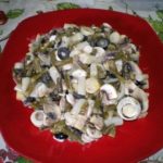 לרוקן את הנוזלים מן השימורים. לפרוס את לבבות הארטישוק (או האספרגוס) לקטעים באורך כ-1 ס"מ. לפרוס את הזיתים לטבעות (יש גם מוכנים בשימורים). להוסיף את השעועית .