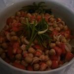 קוצצים את העגבניות לקוביות בגודל בינוני. מפרידים את החלק הירוק מהחלק הלבן בבצל. את החלק הלבן חותכים לשניים לאורך ואילו את החלק הירוק לרצועות דקיקות. פורסים את הפטריות לפרוסות דקות. חותכים את הפלפל לקוביות קטנות. בקערה גדולה שמים את העגבניות, החלק הלבן של הבצל, הפטריות, הפלפל והחומוס ללא הנוזלים. מוסיפים את השמן, החומץ ומעט מלח ופלפל ומערבבים היטב.
