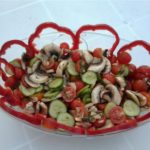 חותכים כל עגבניה לחצאים או לרבעים, תלוי בגודל העגבניות