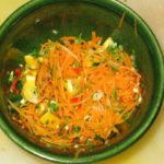 חולטים את הגזר למשך חצי דקה במים רותחים. מוציאים ומעבירים מיד למי קרח. מסננים ומעבירים לקערה. מוסיפים את יתר המצרכים ומערבבים היטב יחד. מגישים קר או בטמפרטורת החדר.
