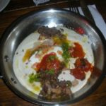 משני צידיו מוזגים מהטחינה יוגורט בנדיבות מעל מסדרים 3 עגבניות שרי וכן חלק מהרוטב שלהן