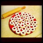 מוציאים מהמקרר מרדדים וקורצים לעיגולים, באמצעות חותכן עיגול קטן יותר בשליש מהעיגולים שרצנו, קורצים עיגול נוסף במרכז במחצית מהעוגיות.