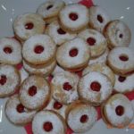 מורחים שכבה דקה של ריבה על העוגיות ומכסים בעוגיות עם החור, מפזרים מעל אבקת סוכר
