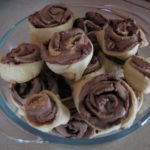 3.מחלקים את הבצק ל4. מרדדים כל חלק ומורחים רבע מקצף המילוי. מגלגלים לרולדה, חותכים לפרוסות.