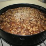 לצקת את התערובת לתבנית וליישר. לפזר מעל את שברי האגוזים המקומחים ולאפות (180°c) במשך 50 עד 60 דקות, או עד שפני העוגה משחימים וקיסם עץ , הננעץ במרכזה, יוצא יבש.