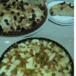 4. מסדרים את תפוחי העץ מעל לבלילה של העוגה. מעל זה מפזרים צימוקים. מפזרים כף סוכר לבן מעל להכל.