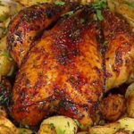 - צולים בתנור שחומם מראש לחום של 200 מעלות כ-50 דקות ומידי פעם משקים את העוף בתערובת שבתבנית
