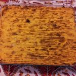 מעבירים את הבשר לתבנית פיירקס ומורחים את מחית תפוחי האדמה והבטטות על הבשר, מישרים ומסמנים חריצים במזלג. אם יש הרבה רוטב לבשר, אפשר לצקת על המחית.
