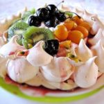 10. חותכים את הפירות, ומרכיבים את המנה: מניחים את המרנג על צלחת הגשה, יוצקים את הקצפת על התחתית ומסדרים את הפירות. מזלפים את רוטב פירות היער ומגישים.
