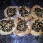 מניחים בשר על כל עיגול בצק ומשטחים אותו על הבצק. מפזרים פטריות וצנוברים ומהדקים אותם לבשר.