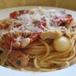 9.מעבירים את הספגטי למחבת עם הקוביות חזה העוף והרוטב ומוסיפים מעט בזיליקום קצוץ ומערבבים היטב.