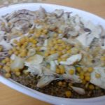 מעל מוסיפים נתחי עוף מהעוף שנאפה וגרגירי חומוס ומגישים