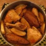 מטגנים את הבצל מוסיפים את העוף וממשכים לטגן, מוסיפים את השום.הפטריות ועלי הדפנה,תפוחי האדמה והבטטות,