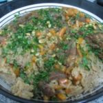 בנתיים מחממים תנור לחום נמוך של 100 מעלות ומכניסים לתוכו את הסיר לעוד כ- 20-25 דקות. מוציאים את הסיר מהתנור ומשאירים אותו מכוסה 1/2 שעה . בעת ההגשה הופכים את הסיר על משטח כגון מגש עגול מעט עמוק או משהו דומה ומקשטים בפטרוזיליה ובצנובר קלוי.