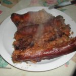 מוסיפים את קוביות הבצל היבש שני שיני שום טרי מלח פלפל שחור ורבע כפית פלפל אנגלי טחון.ממלאים את הקישקע לא דחוס וקושרים בחוט את הקצה.