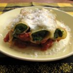 ממלאים את השקית במילוי הגבינה והתרד, חותכים את השפיץ, ממלאים את הקנלוני ומניחים על רוטב העגבניות זה לצד זה.