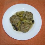 מערבבים את כל החומרים ומכינים קציצות מעט שטוחות. מטגנים אותם במעט שמן זית כדקה מכל צד ומניחים בצד. פורסים את הירקות ומטגנים הכל ביחד ( מוסיפים עוד שמן לפי הצורך ) מספר דקות. מוסיפים את היין, מלח ופלפל שחור ומבשלים על אש גבוהה עד שהיין מצטמצם לחצי.